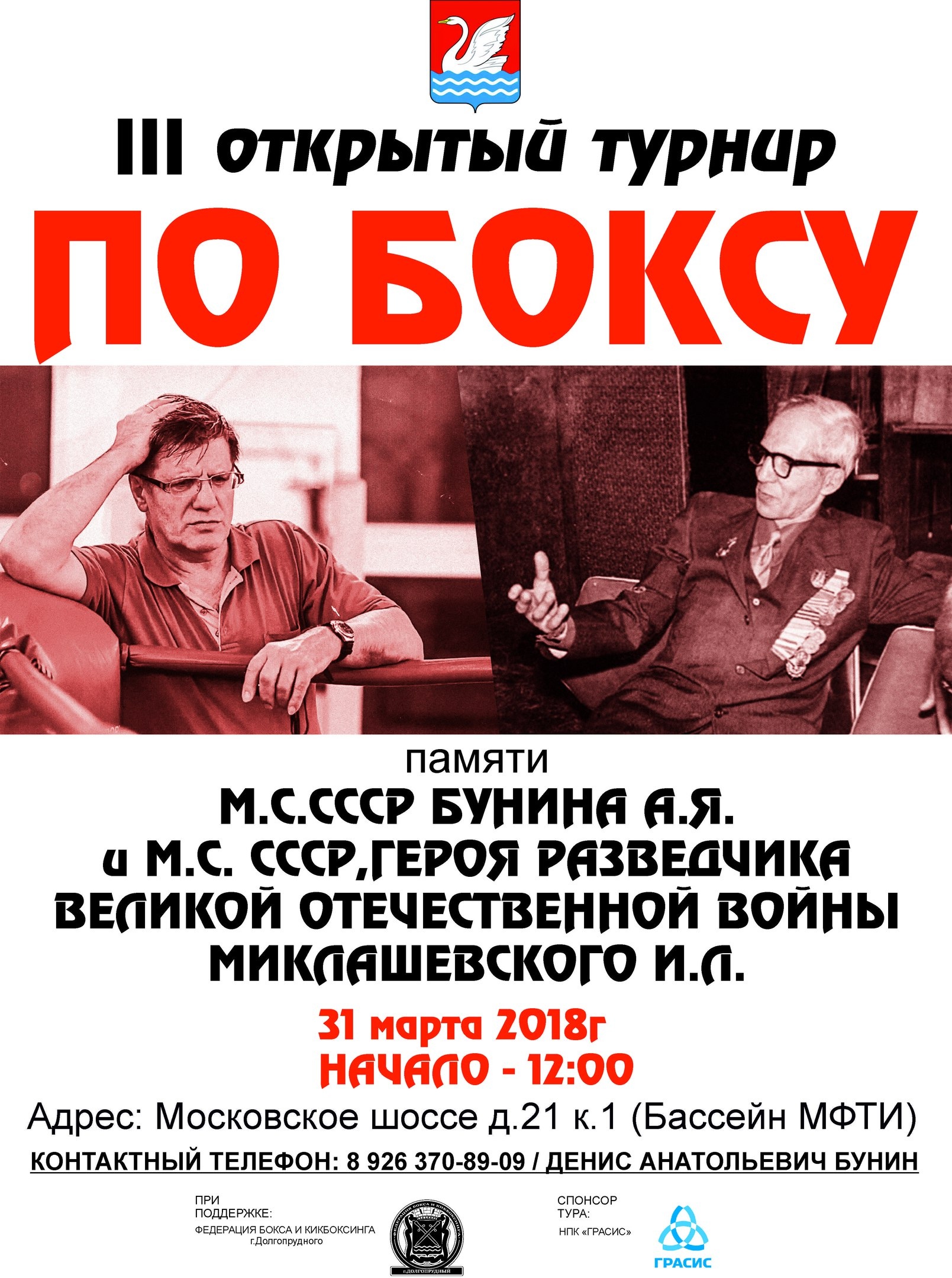 Приглашаем желающих спортсменов и зрителе на третий открытый турнир памяти мастера спорта СССР Бунина А.Я. и разведчика ВОВ Миклашевского И.Л., который состоится 31 марта 2018 года в нашей школе бокса